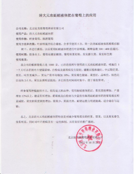北京波龙堡葡萄基地采用有机方式生产和酿制,酒呈清澈的宝石红色,酒体结构丰满,酒香醇厚、稳重,口感平衡,酒品高贵。使用蚯蚓液体肥后,果实甜度增加,产量增加12%以上,穗重有所增加,霜霉病及白粉病明显减轻,果皮韧度增加,裂果少,果面光滑,耐储运能力提高,适合储存与运输。